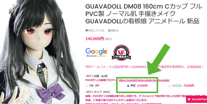 YOURDOLLではここでPVCボディを選ぶと様々な娘をPVCボディでお迎え出来ます。この娘の場合ベース価格140,000円でPVCボディが+27,000円ですから税込167,000円~ということになります。