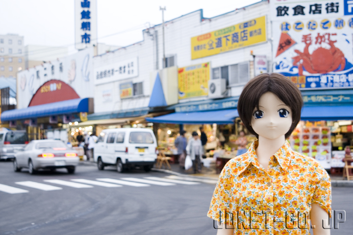函館の朝市、こちらも2003年8月の写真で現在とは朝市の雰囲気も全く異なります。こうした人通りの多い場所での撮影も車いすでドールを運んで、立ちポーズに関節を動かして変更、指の先まで細かく関節をチェックして自然なポーズになってシャッターを切るとなると大変です。